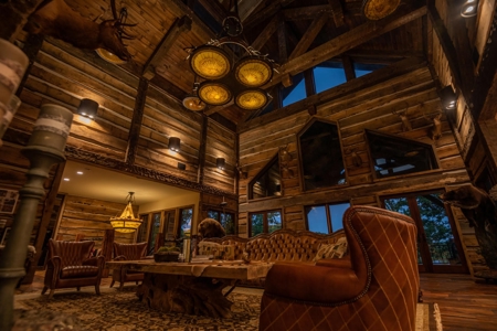As you enter through your own private security gates you will notice the ¼ mile long private, stained and stamped concrete driveway that leads you to “The Lodge on the Lake" This one-of-a-kind custom timber framed built Lodge that was erected in 2019. I cannot begin to describe the one of a kind features this Home/Lodge has to offer. Beginning with the luxurious 14’ tall custom cypress handmade entry doors to the 55 ft tall fireplace built of native stone from Missouri and Arkansas. The main entrance has enormous, vaulted ceilings that brings the feel of a true mountain Lodge. The interior walls are made of oak twice kiln dried flat logs along with 2 x 6 walls filled with spray foam insulation. The inside post beams are all Douglas Fir and outside post beams are made from Cypress logs. The wood flooring, interior doors and interior trim in this home came from the Old Springfield Missouri stockyards and they have all been refinished and used throughout the home.