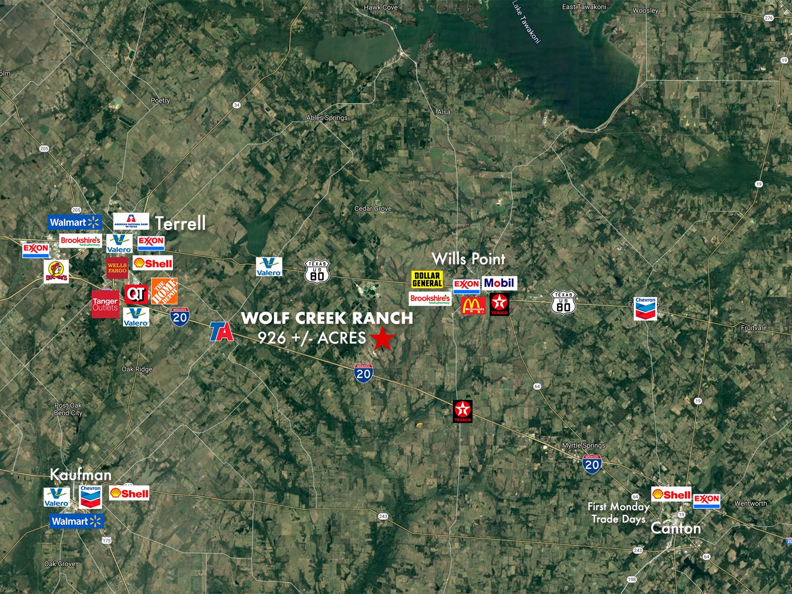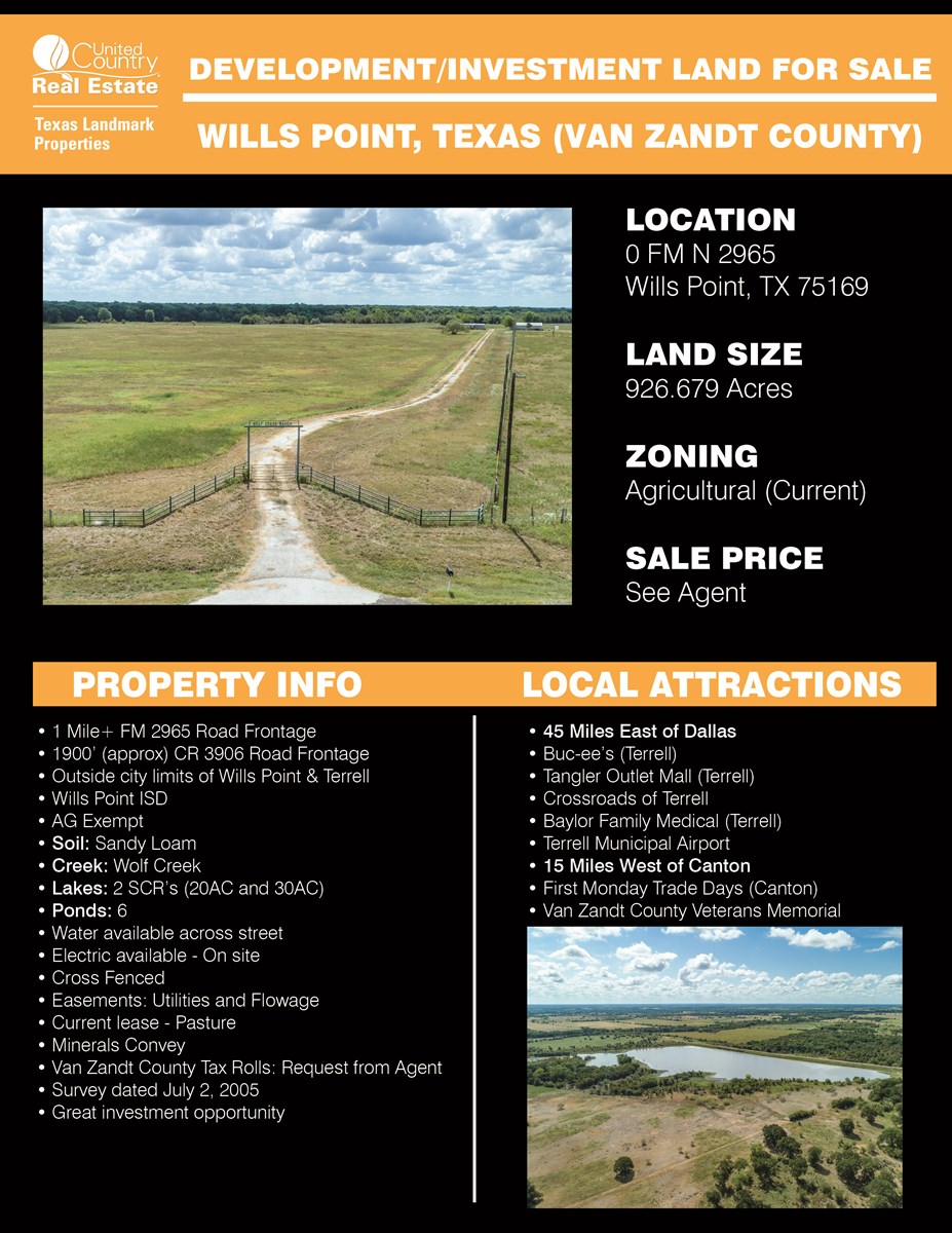 Stunning Development and Investment property 45 miles NE of Dallas. There are 2 SCR lakes along with multiple ponds and creek. The lakes are 20AC and 30AC which is ideal for waterfowl, recreational, hunting and property is cross-fenced for cattle rotation. Access to I-20 to the West and Hwy 80 to the East. Approx 1+ miles of FM 2965 RF and 1900' CR 3906 RF which winds around to I-20 creating a very secluded country estate. Outside City Limits and AG Exempt. The property is currently utilized for agricultural purposes and not zoned. See FLYER and MAPS and SURVEY in Documents.