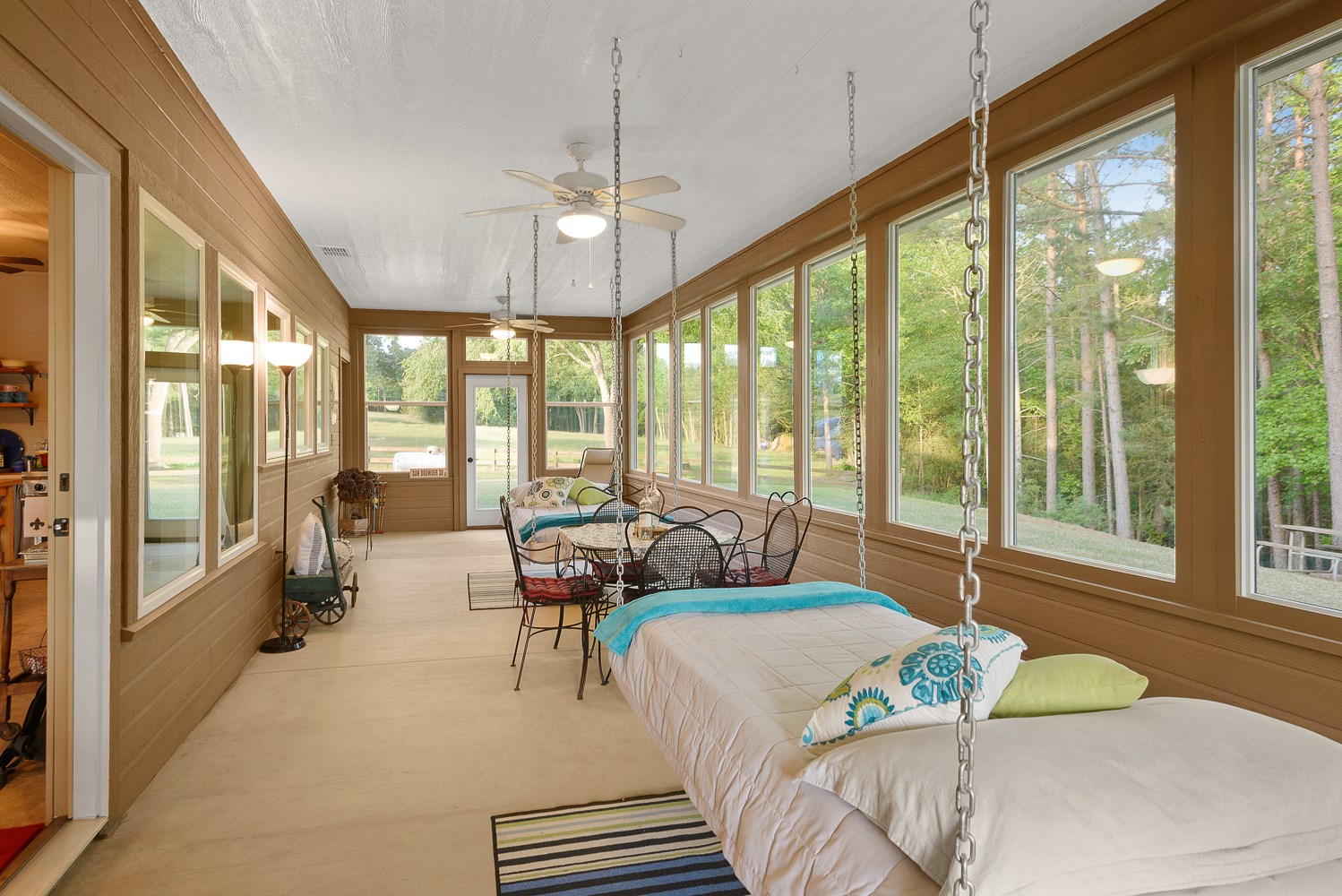 One of the most notable improvements on the East Texas Browder Ranch is the addition of the 1286 square foot Country Cabin situated on the waterfront to take full advantage of the beautiful views of the private lake along with sunrises and sunsets over the water. The covered front porch spans the width of the cabin and is perfect for morning coffee as the sunrises over the lake. The cabin has a magnificent open design with a country kitchen that flows into the dining area that flows into the living room all with views of the lake. The cabin has 1-bedroom and 1 bathroom and a wonderful enclosed uniquely designed sleeping porch for extra guests, family and grandkids.